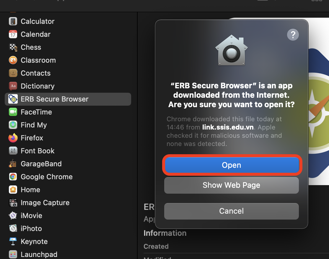 Step 18: Open Finder, go to Applications and double click the 'ERB Secure Browser' application to open it. Click 'Open' if you see a box like the one below.