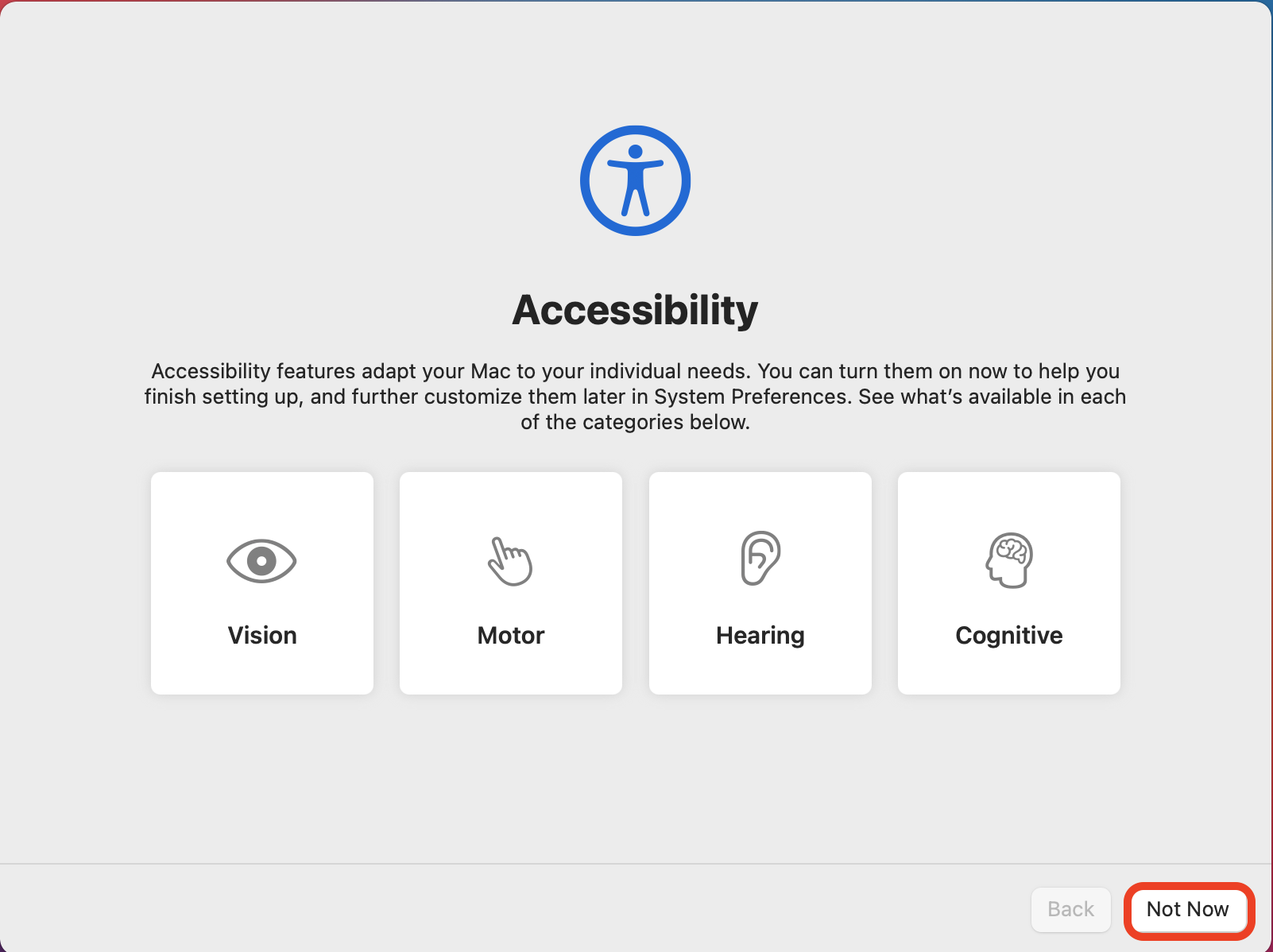 Step 3: If you see the screen below about Accessibility, click 'Not Now' or 'Continue'.