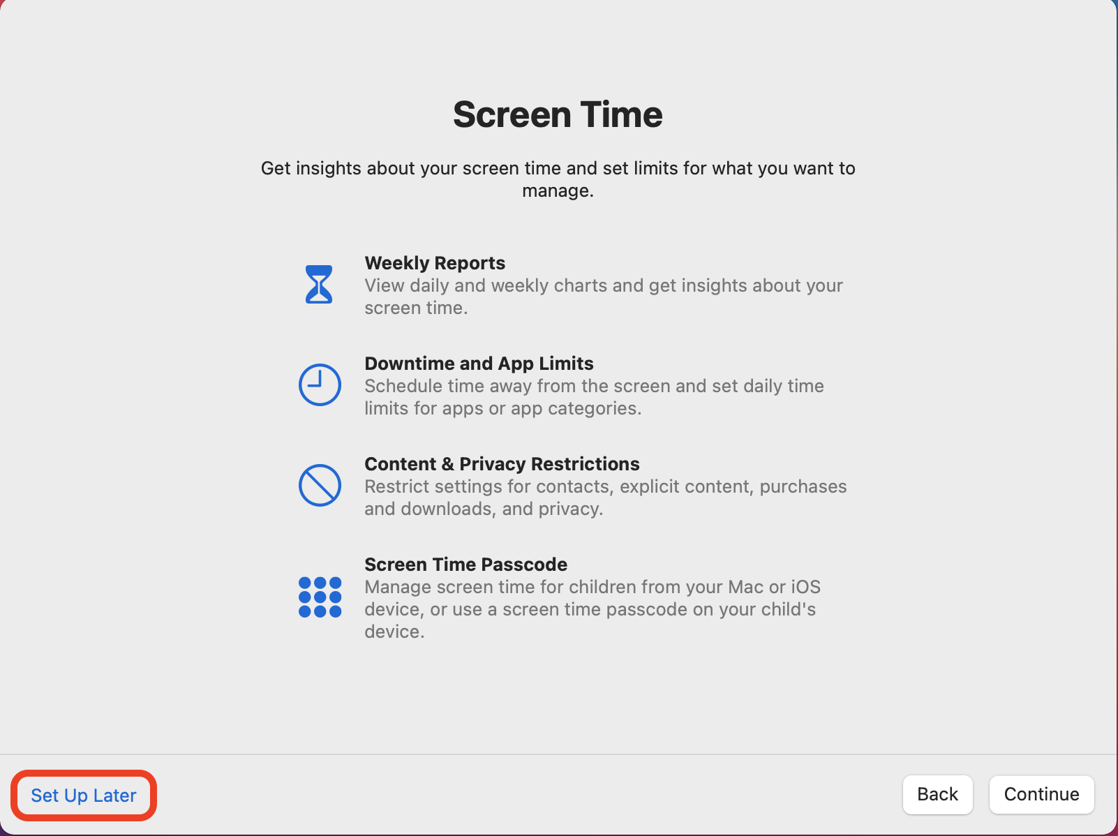 Step 6: If you see the 'Screen Time' screen, choose 'Set Up Later'.