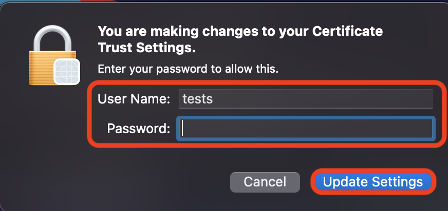 Step 16: On the next screen, type in the admin password for the 'tests' user account, then click 'Update Settings'.