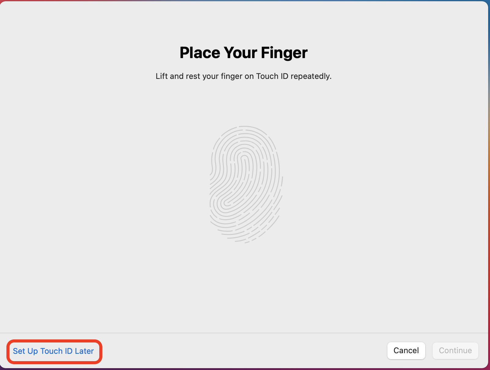 Step 10: If you see the 'Place Your Finger' notice for Touch ID, click 'Set Up Touch ID Later'.