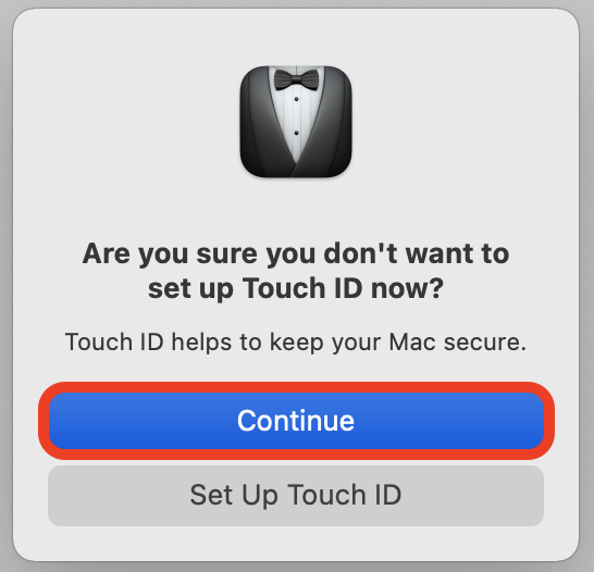 Click 'Continue' to confirm that you want to set up Touch ID later.