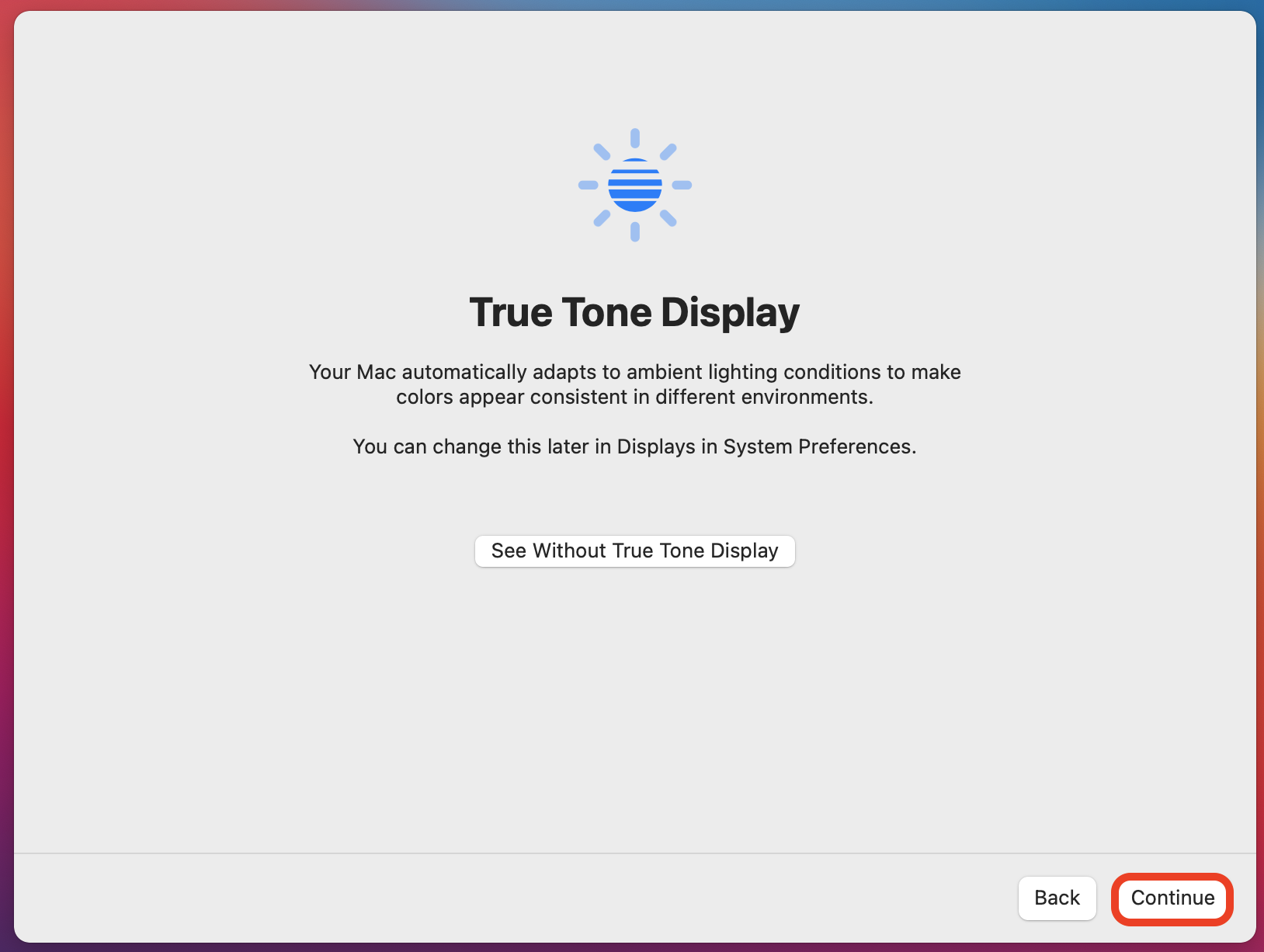 Step 12: If you see the 'True Tone Display' screen, click 'Continue'.