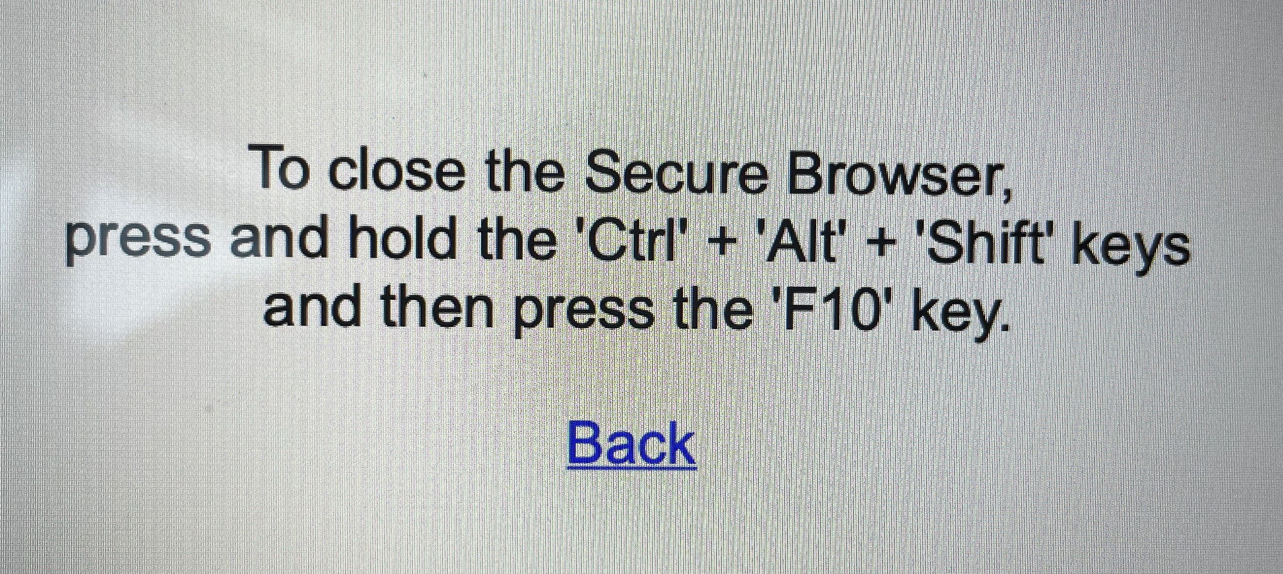 Step 20: Press Close (top right) to exit the test browser. You will be prompted with the message below These instructions are for a Windows PC. You will need to hold down shift + fn + control + option then tap the F10 (mute button) on your keyboard.