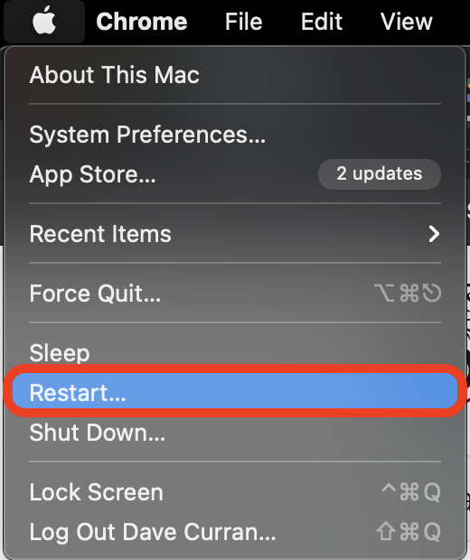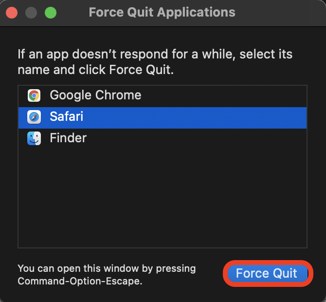 Step 3: Open Finder and hold down option (alt) + command (CMD) + escape (ESC) to open the 'Force Quit Applications' box. Select any applications that are still open and click 'Force Quit'.