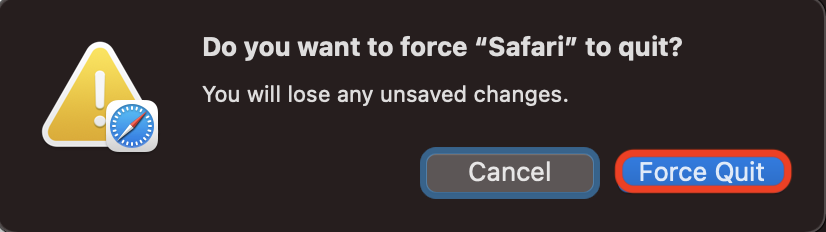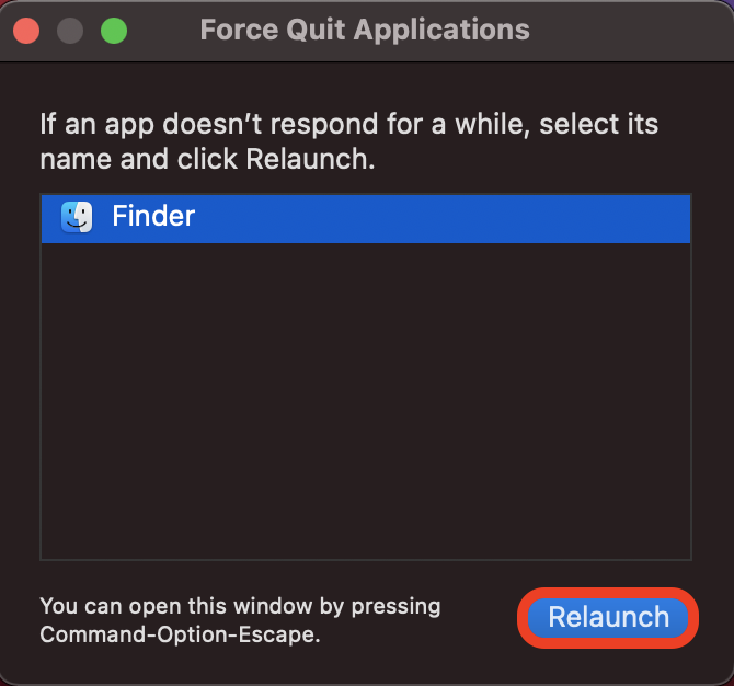 - Use option (alt) + command (CMD) + escape (ESC) to open the 'Force Quit Applications' box.