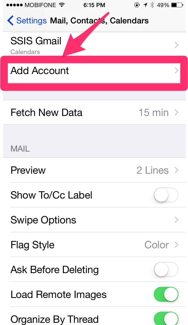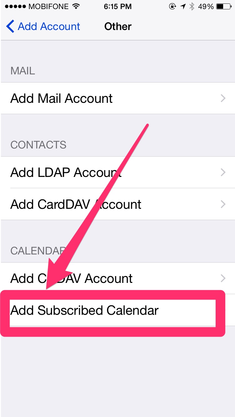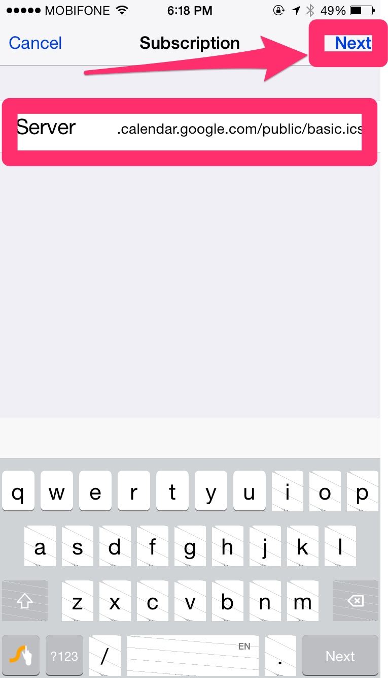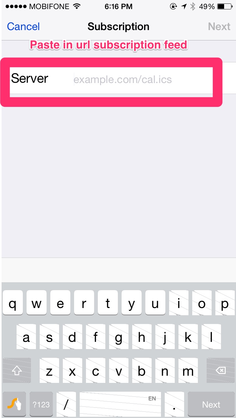 8. Go back to your Mail, Contacts, Calendars Setting and Paste in url subscription feed from Step 5