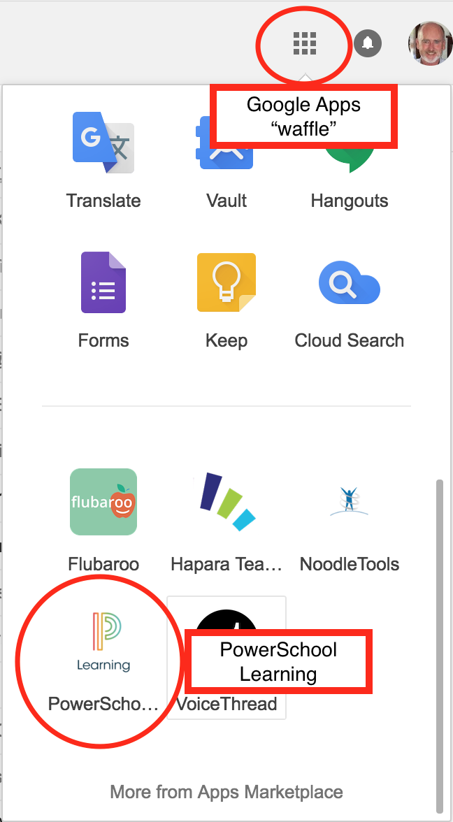 Click on the Google app "waffle" icon and scroll through the app options to find PowerSchool Learning (at the bottom of the list).