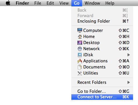 Step 1: From the Finder choose Go->Connect to Server (or press Command-K)