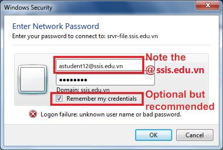 Step 3: Enter your SSIS Network username, followed by "@ssis.edu.vn", and password (same password that you use for printing, for accessing the computers in the lab)