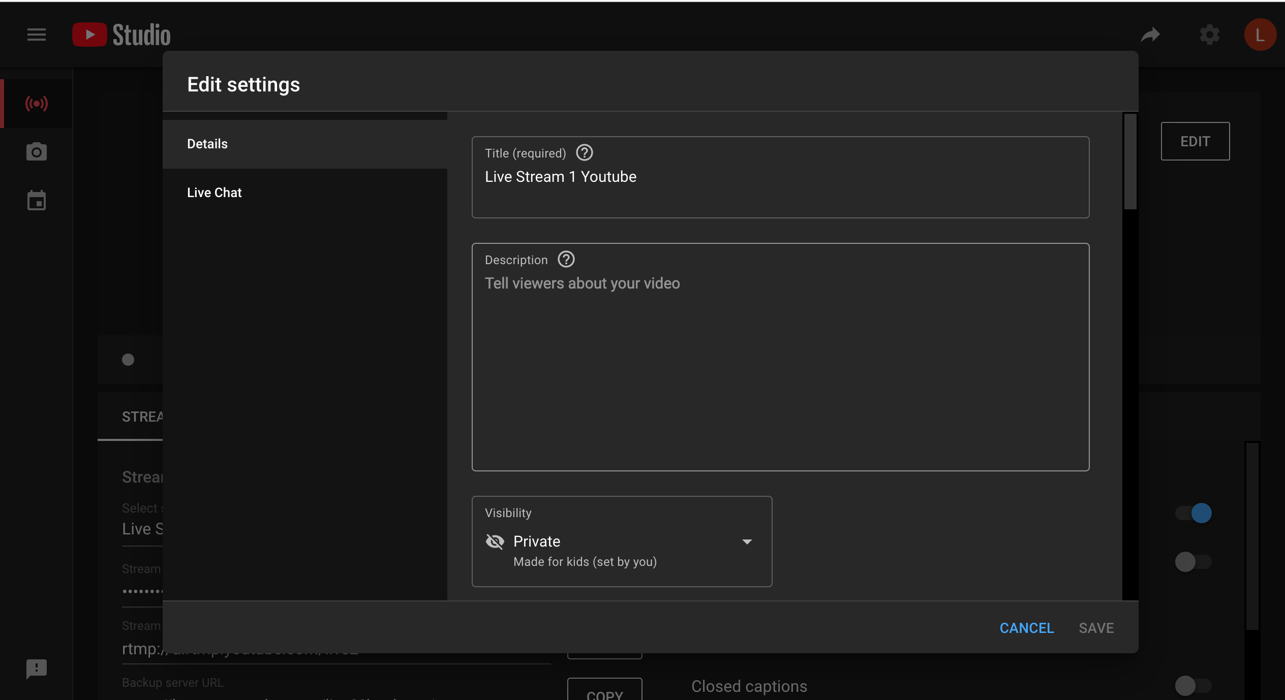 • Stream Settings should not be changed and/or a Stream Key resetted. Steam Settings are for verification of the Stream Key on the device, app, or program (encoder) you are using to livestream. (example: OBS, LiveNow, RTMP Live, YT Studio...) If the Stream Key does not match the Stream Key on the encoder, the livestream will not stream on youtube.com.