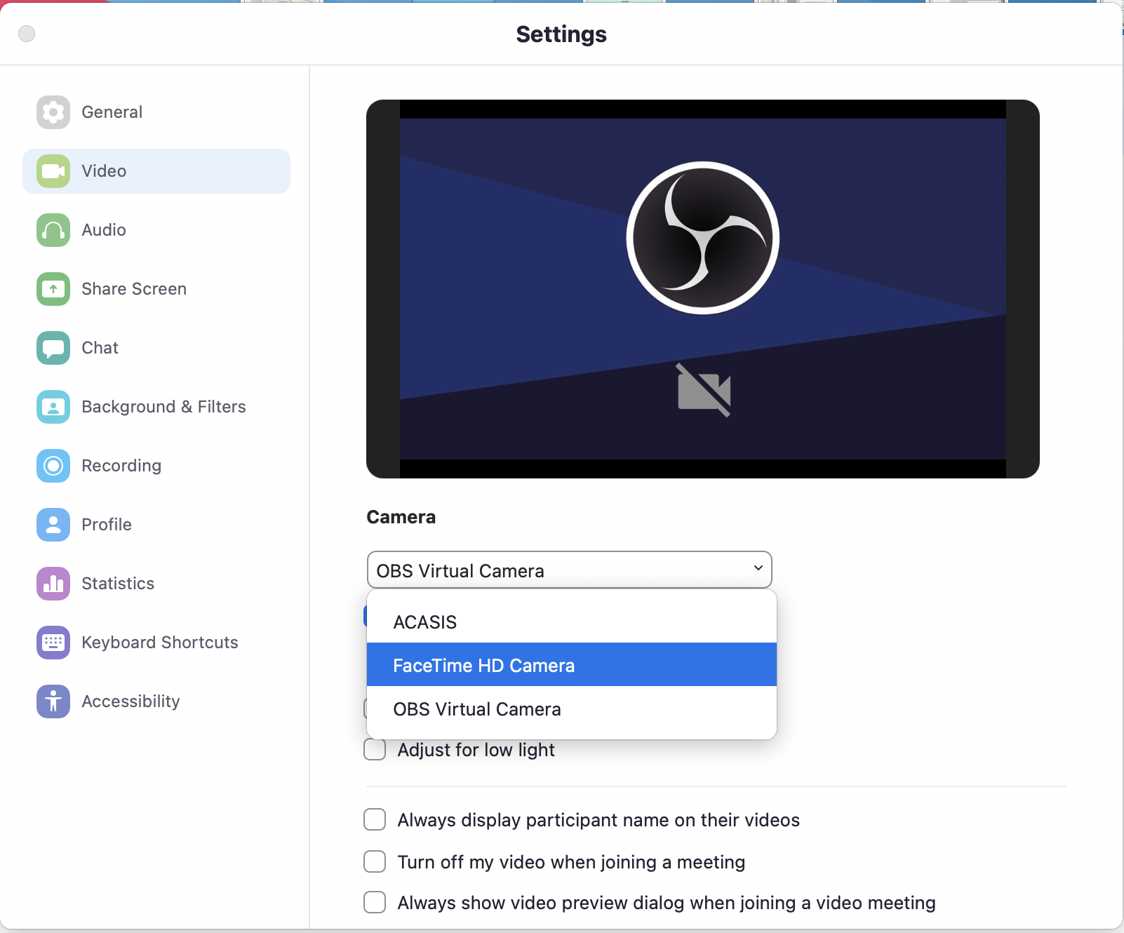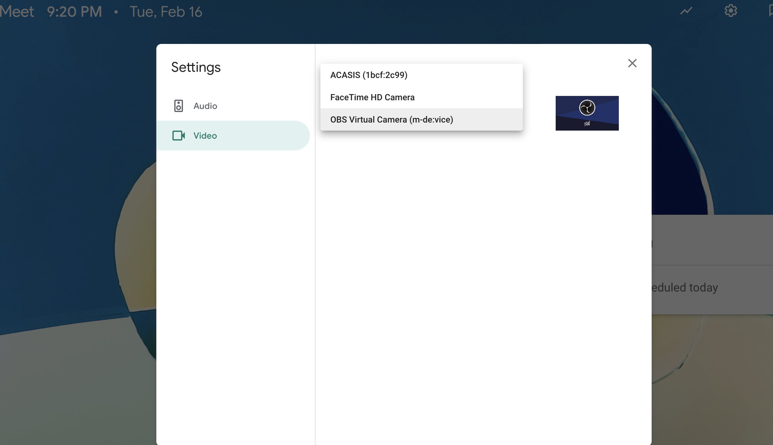 OBS can be used as an external video source on GOOGLE Meets, Zoom, or other video conferenceing software by clicking on the Start Virtual Camera option.  On the video concerencing software you would change the video input source to OBS Virtual Camera.