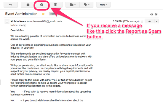 If this happens to you just click the Report as Spam button (it looks like an exclamation mark inside a stop sign - see below).