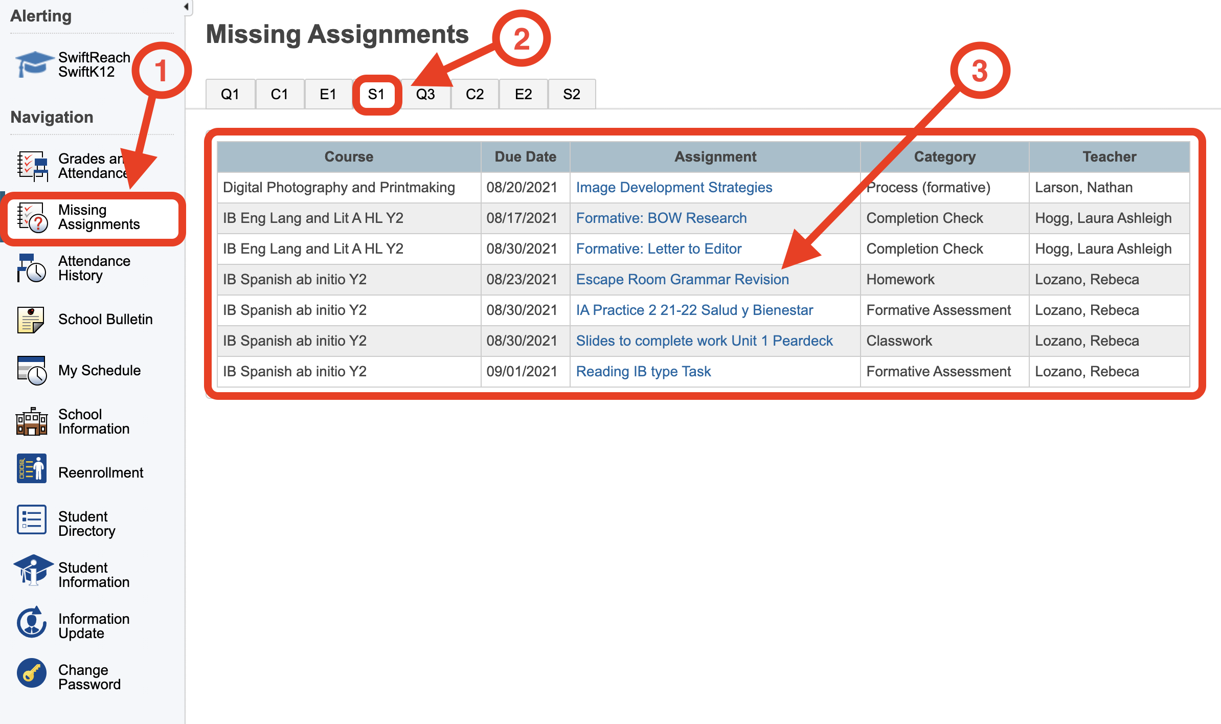 1. In the left menu select Missing Assignments
