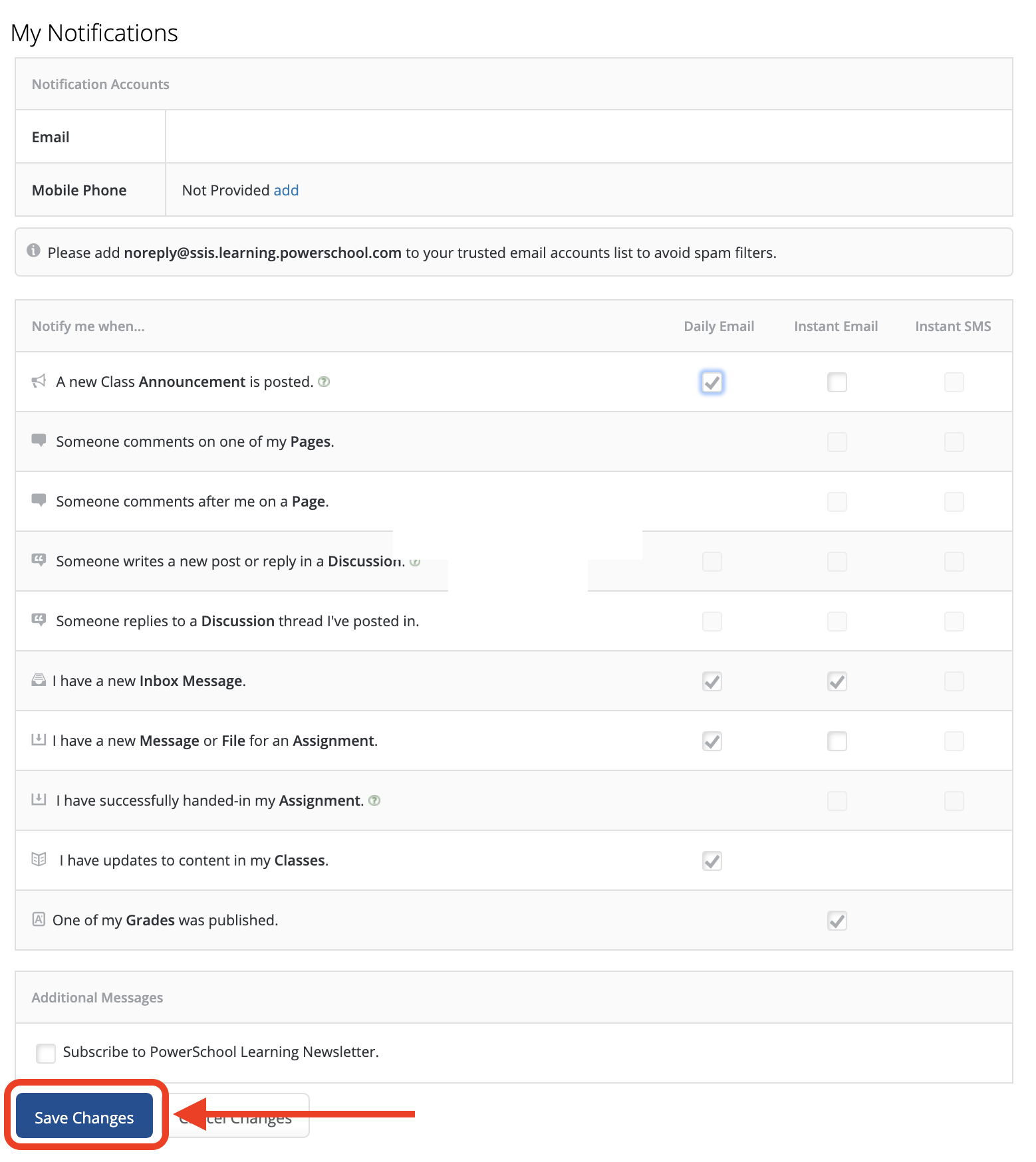 On this page, you can modify the frequency and type of notifications you receive. If you do not want instant notifications, please uncheck all boxes in this column. Then click the save button to save the changes.
