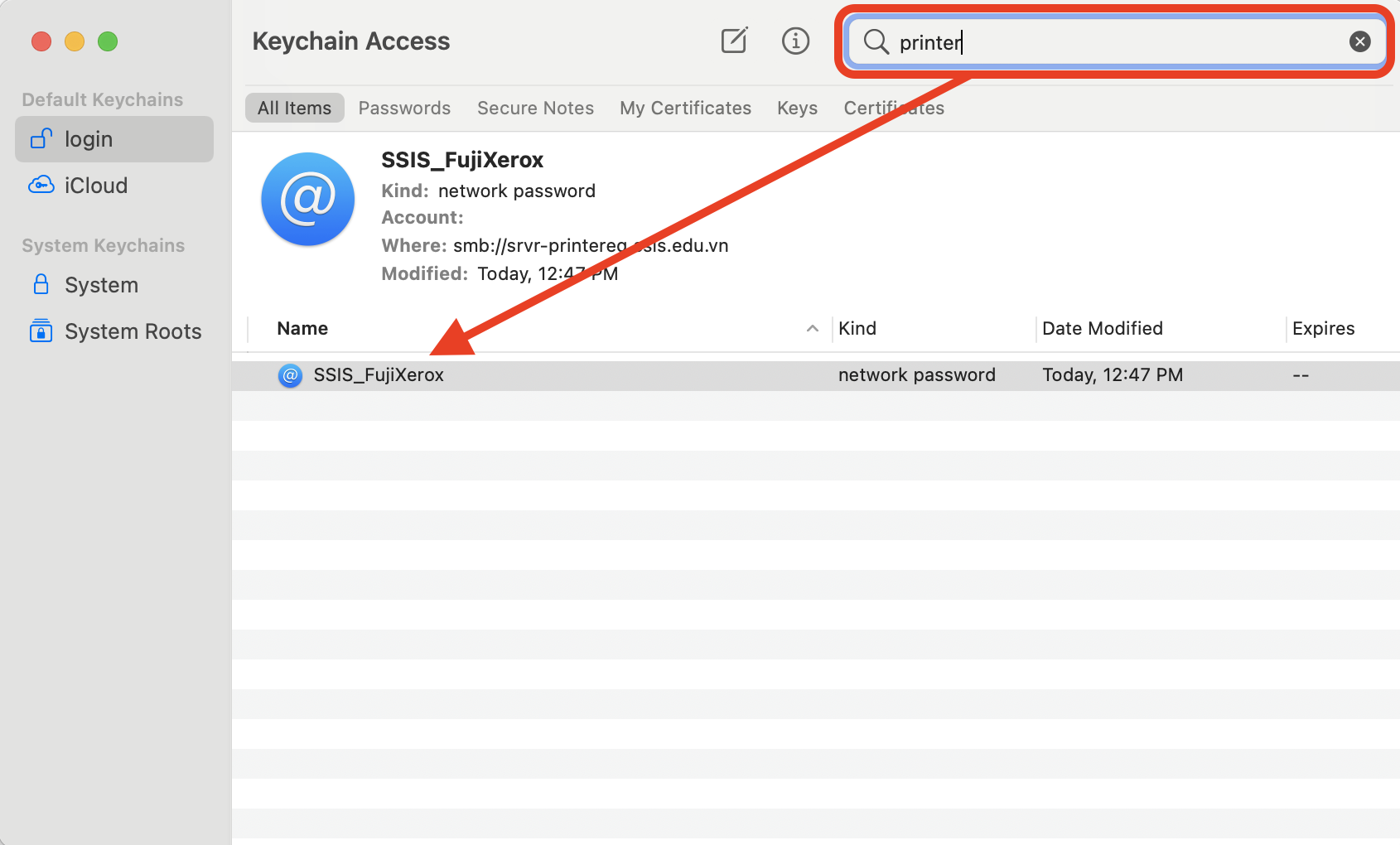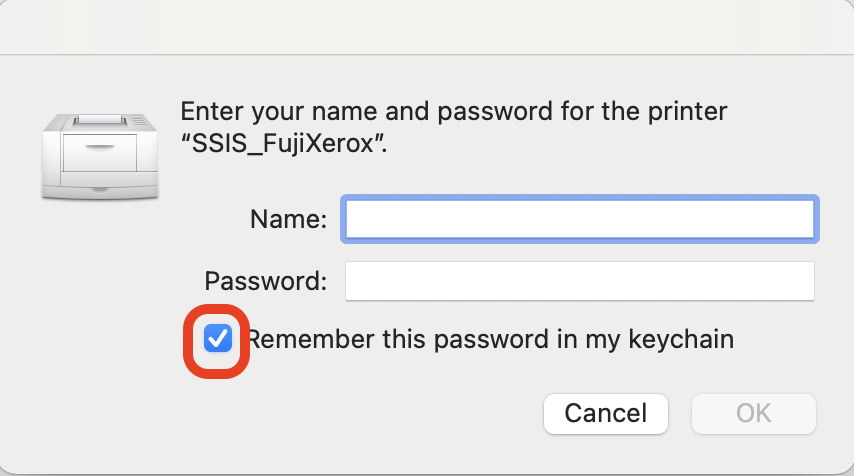 In Keychain do a search for ‘printing’, it should then find the SSIS_FujiXerox’ stored credentials. Right-click on this entry and choose Delete "SSIS_FujiXerox"