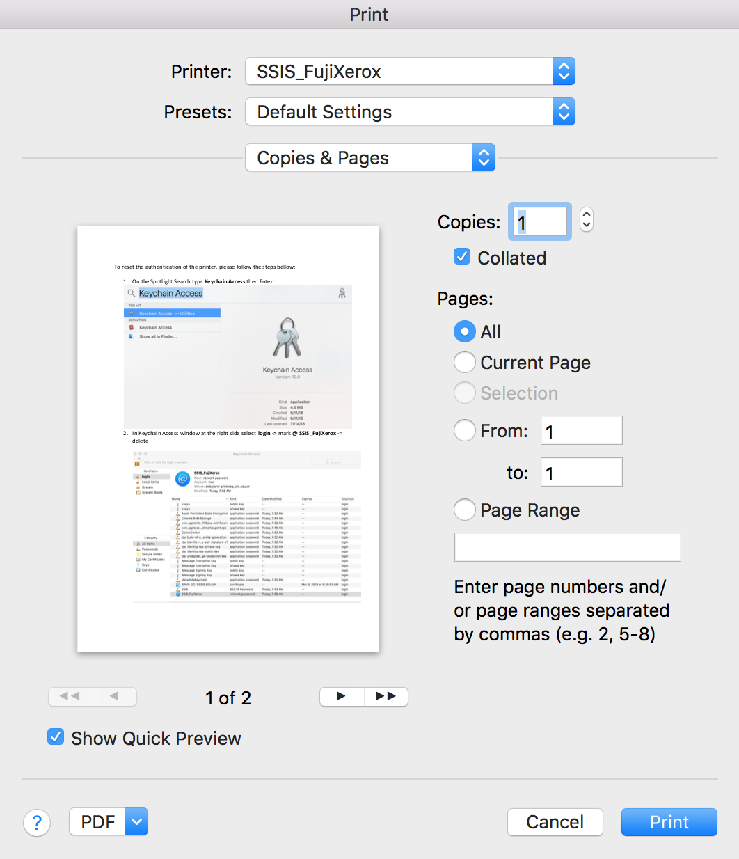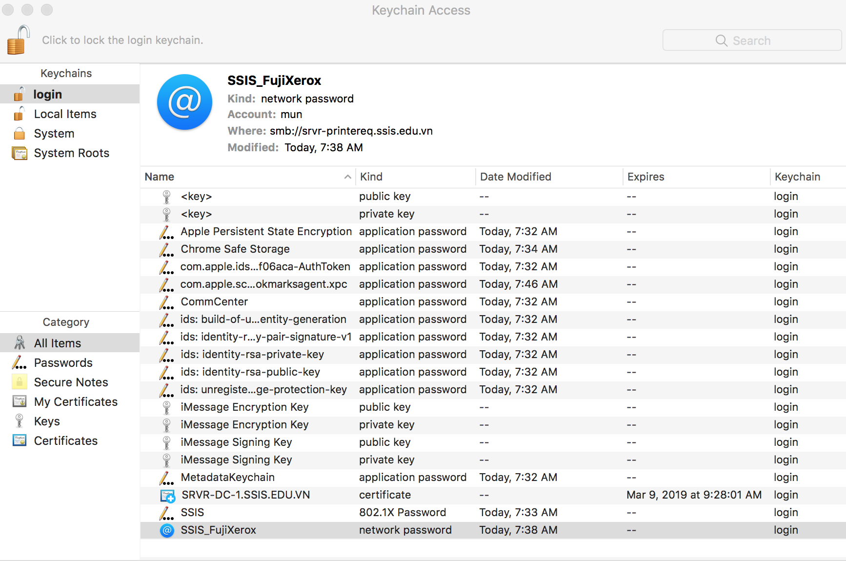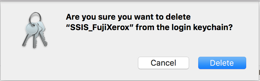 2. In Keychain Access window at the right side select login -> highlight @ SSIS_FujiXerox -> click delete.