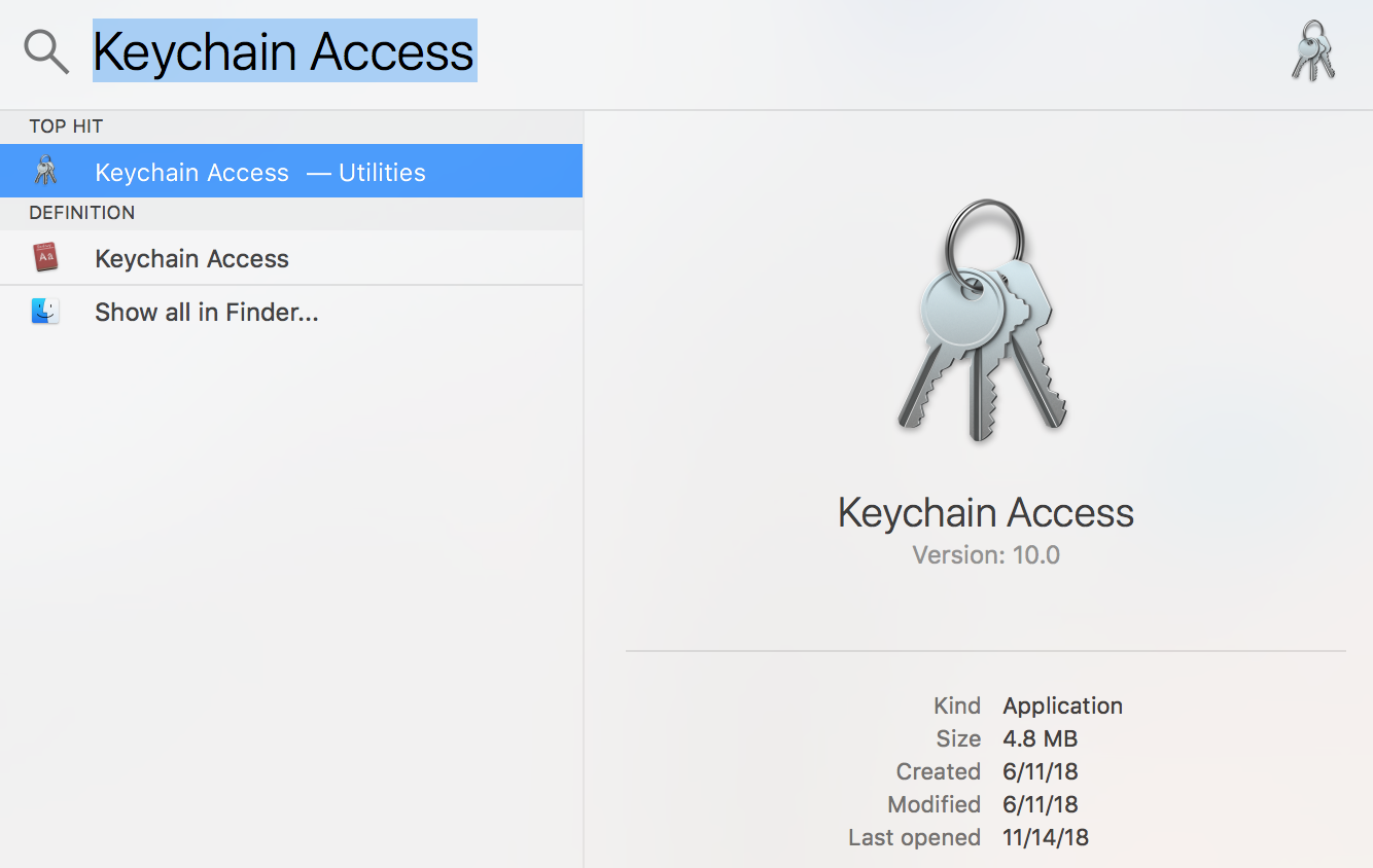 1. Open the Spotlight Search type Keychain Access then press Enter