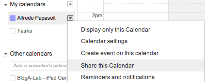 In the calendar list on the left, click on the down-arrow button next to the appropriate calendar, then select Share this calendar.