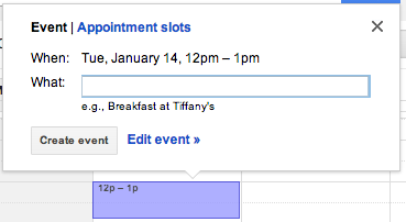 Option 2: Or, click a spot on your calendar to create a 1-hour event. Click and drag to create an event of more than 1 hour. Then type the event title in the box. Here’s an example: