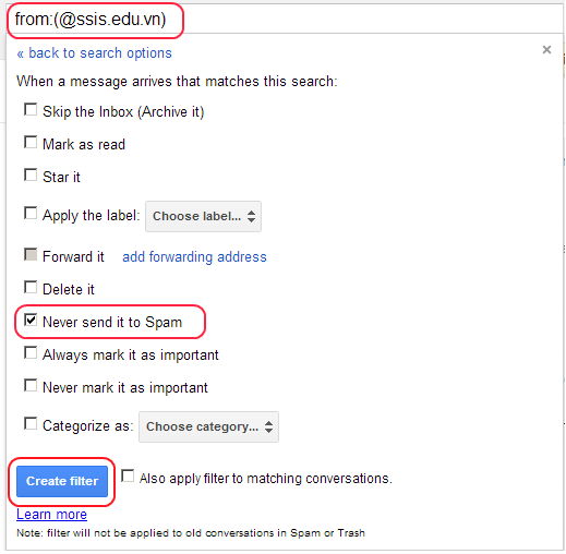 4. Click the box next to Never send to Spam. Then click the blue Create Filter button (Lower left)